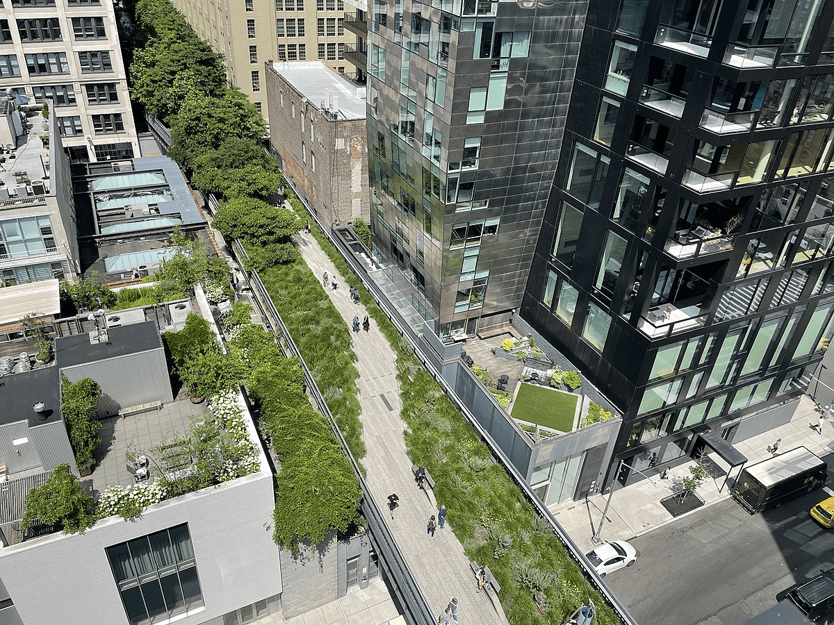 Еще одним местом, где активно развивается устойчивый туризм благодаря городской власти является Хай-Лайн, бывшая надземная железная дорога. Данная железнодорожная линия была преобразована в небольшой линейный парк. Туристы здесь имеют уникальную возможность прогуляться среди зеленых насаждений с прекрасным панорамным видом на Нью-Йорк. Реновация старого инфраструктурного объекта была проведена с учетом всех принципов устойчивого развития. Ньюйоркцы и жители города здесь могут встретить как разнообразие растений, так и систему сбора дождевой воды, а также экологически чистые материалы.